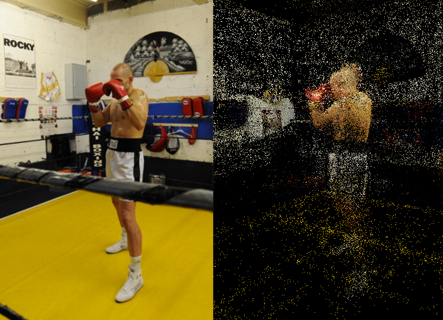Suena extraño y un poco incomprensible, pero el programa se apoya en una creciente red de usuarios de alrededor del mundo que van tomando diferentes fotos de una pieza, objeto, edificio o espacio en común y al subirlas al programa las linkea y genera lo que llaman un synth. Este es un archivo compuesto por cientos de fotografías de distintos autores que generan una sola imágen. Acá se ve el ejemplo de una imágen de un boxeador y la referencia de links generada por el programa (esos miles de puntitos)… las demos parece muy buenas y según sus creadores… va a generar una revolución en la navegación por internet… lo que es evidente es que vamos a necesitar memorias mas grandes para nuestras cámaras…