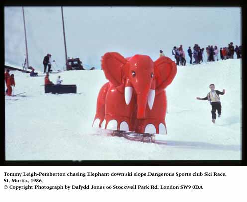 Esto generó mucha atención sobre el grupo y les permitió ganar unos cuantos adeptos que estaban deseosos de aventura. En pleno apogeo, el DSC buscaron generar otro deporte. Este consistía en descender una montaña nevada, en este caso St. Moritz, sobre una escultura montada en skis… por ejemplo el elefante inflable de la foto. Cuenta la leyenda, que el tamaño de esta “escultura” fue creciendo y creciendo, hasta que los miembros de la DSC intenaron tirar un double decker brit por la ladera de la montaña, pero los momias de la organización no los dejaron… daba un poco tiuh…