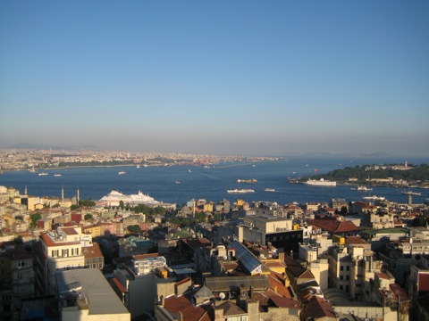 Siempre fui fanático del Mediterráneo, no por sus islas paradisíacas, ni por sus playas nudistas… aunque debo admitir que en algo ayudan… sino más bien por su historia… por las cantidades de guerras, navegantes, conqistadores, daventureros y cosas que pasaron por ahi… Subido en la Peta Tower, en el bar del último piso… conocí al contrincante Mediterráneo… compuesto por una tripleta mágica y flashera entre el Marde Marmara, el Bósforo y el Cuerno de Oro (un nombre genial para un estuario… no?). Pensar que hace unos siglos… este era el centro del mundo…