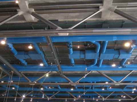Su manifesto decía algo asi cómo, intentar limpiar el interior del edificio de los sistemas para ampliar las superficies de exposición… por lo cual todos esos sistemas, cómo escaleras, ascensores, cañerías de agua, descargas pluviales y todo tipo de instalación posible iría por fuera… y asi lo hicieron… porque ganaron… no sólo sacaron las entrañas del edificio hacia afuera… sino que las pusieron en evidencia con un código de colores típico del plano de arquitectura… este estilo es conocido como Bowellism