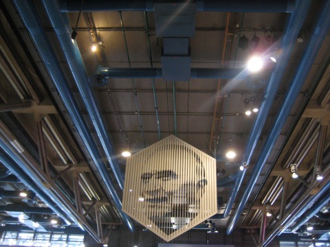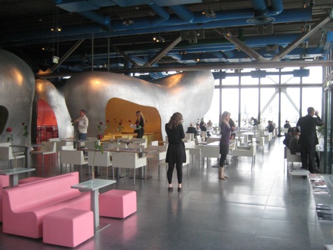 Otra de las cosas de las que nunca me canso es del restó, Georges en el último piso del centro… una gran recomendación del gato allá por el año 2001… El diseño de Jakob & MacFarlane pone en evidencia las bondades de Bowellism, armando una serie de blobs (unidades amorfas) plateados dentro del gran vacío planteado por el último piso. Más allá de que el lugar puede ser un tantito salado, la verdad es que tiene una vista impresionante… la verdad es que nunca había pensado que el Pompidou (o Feaubourg como le dicen los frenchos) era tan alto… sobrepasa toda la uniformidad de Paris, y se ve todo… vale la pena pagar para ver eso…