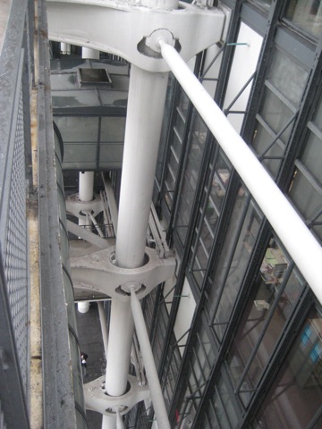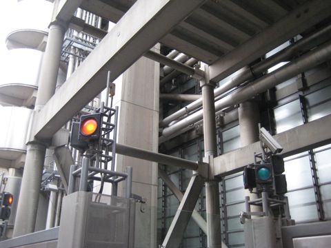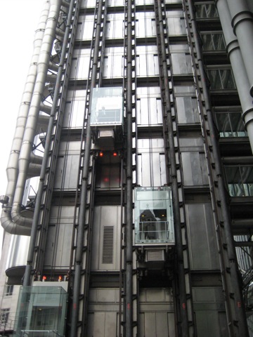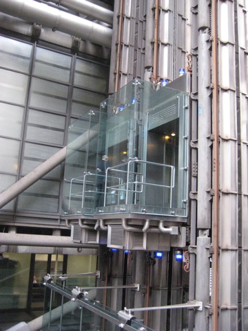 Los ascensores en este caso cumplen la función de la serpenteante escalera del Pompidou, evidenciar el movimiento de los usuarios del edificio. Las cajitas de cristal son completamente alucinantes… Para la época en que fueron hechas no existía algo igual en suelo inglés…