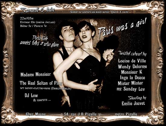 Chez Moune, era un antiguo cabaret de lesbianas (si no me equivoco, fue el primer cabaret de lesbianas… o quizás el primero parisino…) que aún hoy mantiene su estéica bajofondista y putrefacta, a tono de los otros chiringuitos del barrio de Pigalle. Hace no mucho tiempo, un par de flacos (entre ellos André, del que les contaba ayer), lo tomaron y comenzaron a ondearlo y regentearlo de otra calaña de gente, más roquera… pero no se porque, el día que caímos en banda, les había pegado por el revival, y terminamos sumergidos en una fiesta/soirée lesbiana…