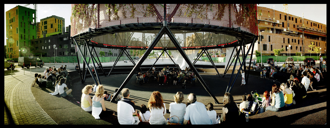 Ahora, cómo los terrenos originalmente eran de carácter desértico, y lo que se intentaba fomentar es que la gente comience a apropiarse rápidamente del barrio y de su espacio público, y la convención dice que las plazas o los espacios arbolados son ideales para tal desarrollo, pero para que esto se genera naturalmente deben esperarse entre 15 y 20 años… el estudio de arquitectos llamado Ecosistema Urbano, desarrolló tres estructuras, iconos, espacios de reunión para que la gente se identifique y comience a apropiarse del espacio público.